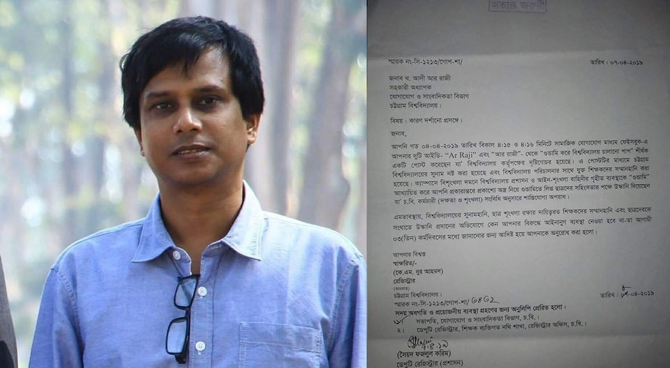 ফেসবুকে পোস্ট দেয়ায় চট্টগ্রাম বিশ্ববিদ্যালয়ের যোগাযোগ ও সাংবাদিকতা বিভাগের সহকারী অধ্যাপক খ. আলী আর রাজীকে কারণ দর্শানোর (শোকজ) নোটিশ দিয়েছে বিশ্ববিদ্যালয় প্রশাসন।