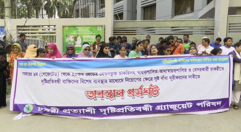 নবম থেকে ২০তম গ্রেডের বেতনভুক্ত সরকারি, স্বায়ত্তশাসিত ও আধা স্বায়ত্তশাসিত চাকরিতে দৃষ্টি প্রতিবন্ধীদের বিশেষ নিয়োগের দাবিতে অবস্থান কর্মসূচি পালন করেছে চাকরি প্রত্যাশী দৃষ্টি প্রতিবন্ধী শিক্ষার্থীরা।