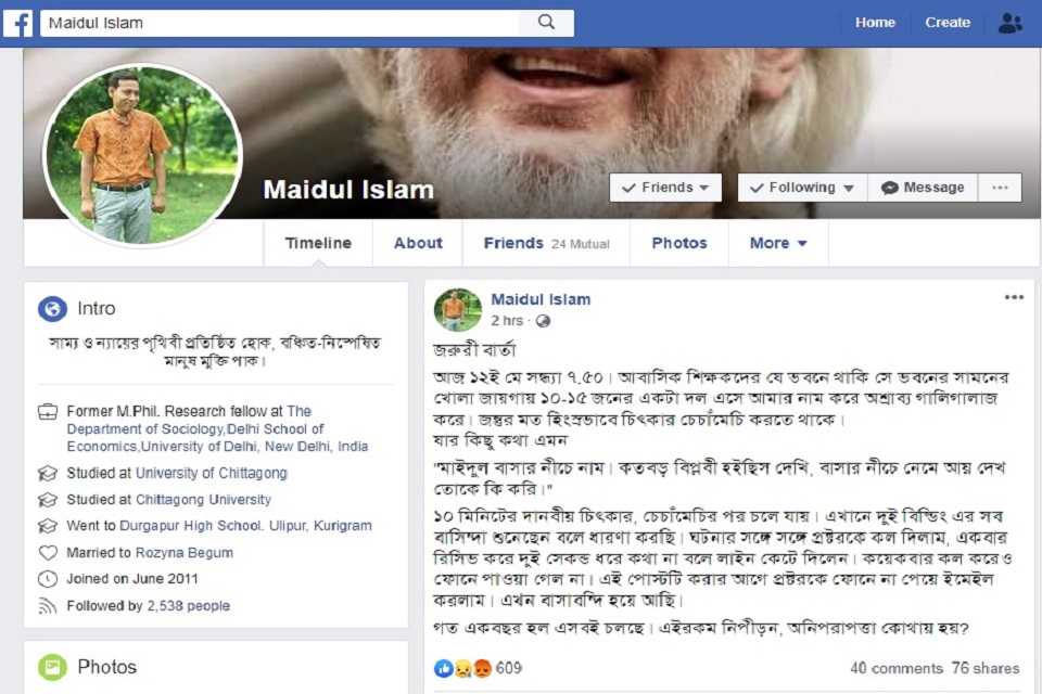 আজ সন্ধ্যার দিকে চট্টগ্রাম বিশ্ববিদ্যালয়ের সমাজবিজ্ঞান বিভাগের সহকারী অধ্যাপক মাইদুল ইসলামকে হুমকি দিয়েছে একদল অজ্ঞাত যুবক।