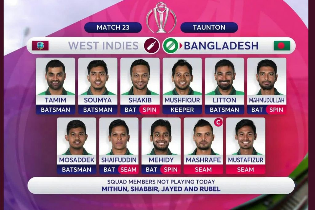 উইন্ডিজের বিপক্ষে বাংলাদেশ একাদশে পরিবর্তন এনেছে টিম ম্যানেজমেন্ট। মিডল অর্ডারে মোহাম্মদ মিঠুনের স্থানে দলে জায়গা পেয়েছেন লিটন দাস। ম্যাচের আগে রুবেল হোসেনের খেলা নিয়ে অনেক কথা হলেও শেষ পর্যন্ত একাদশে জায়গা হয়নি তার।