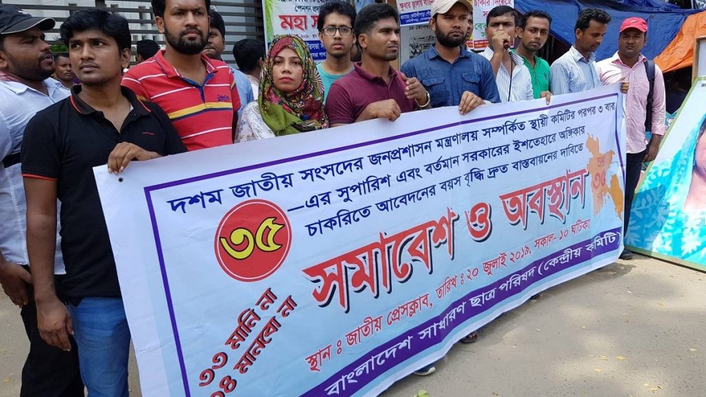 সরকারি চাকুরিতে প্রবেশের বয়সসীমা ৩৫ করার দাবিতে অবস্থান কর্মসূচি পালন করেছে, বাংলাদেশ সাধারণ ছাত্র পরিষদ। সকালে জাতীয় প্রেসক্লাবের সামনে সমাবেশ করে তারা।