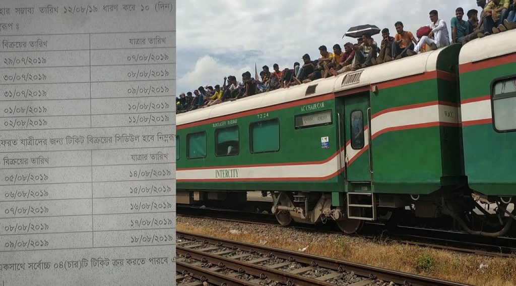 রেলের পরিকল্পনা অনুয়ায়ী, অগ্রিম টিকিট বিক্রির প্রথম দিন ২৯ জুলাই বিক্রি করা হবে ৭ আগস্টের টিকিট। এরপর, পর্যায়ক্রমে ৩০ জুলাই ৮ আগস্টের, ৩১ জুলাই ৯ আগস্টের, ১ আগস্ট ১০ আগস্টের এবং ২ আগস্ট ১১ আগস্টের আগাম টিকিট বিক্রি করা হবে।