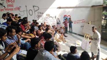 সিঁড়িতেই ক্লাস নিলেন ঢাবি শিক্ষক ড. রুশাদ ফরিদী