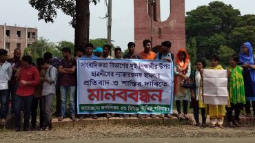 ছাত্রলীগ কর্মীদের বিচারের দাবিতে জাবির সাংবাদিকতা বিভাগের শিক্ষার্থীদের মানববন্ধন